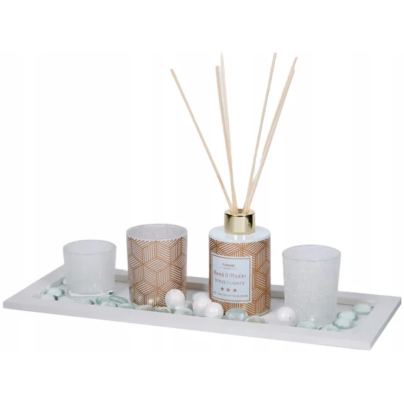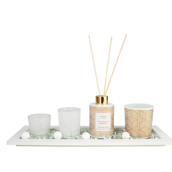 A unique experience of luxury and fragrant scents with the aromatic set featuring a stylish mirror base, luxurious fragrance oil, aromatic candles, and wooden sticks to spread the fragrance in every corner.