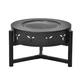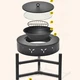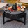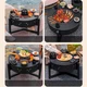 A modern barbecue table with a stylish, round design, combining an outdoor fireplace, a barbecue grill, a serving tabletop, and a charcoal or wood-fired heating basin.