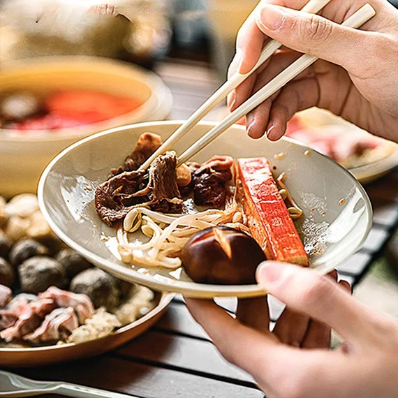 Everything you need for an outdoor meal: soup bowl, 2 serving plates, 2 small plates, 4 cups, 4 spoons, and 4 pairs of chopsticks.