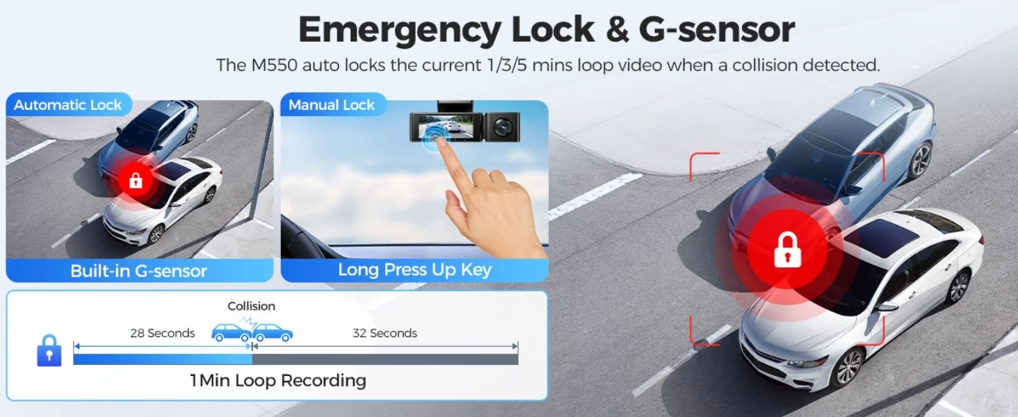 Protects videos from automatic deletion when a collision or accident occurs by securing the video as an emergency file.