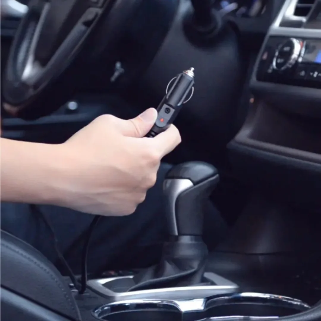 Equipped with a 12V car cigarette lighter plug for instant power connection anytime.