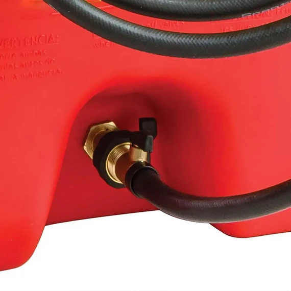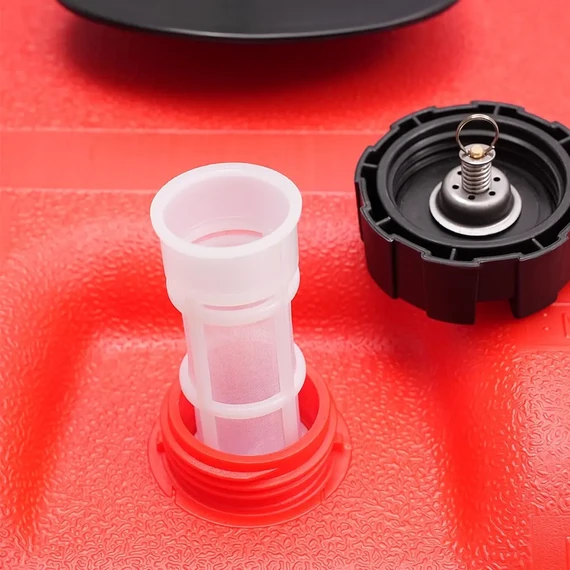 Equipped with a wide top spout and a secure cap for fuel filling. The spout also includes a built-in filter to purify the fuel and prevent impurities. Additionally, it features a brass bottom valve for quick and safe fuel emptying.