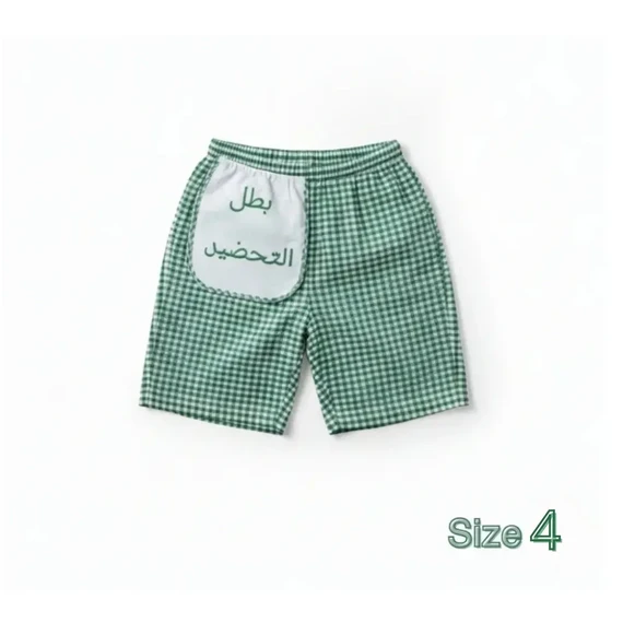 Shorts with a distinctive touch featuring the classic green checkered pattern and front embroidery with the phrase "Greening Hero".