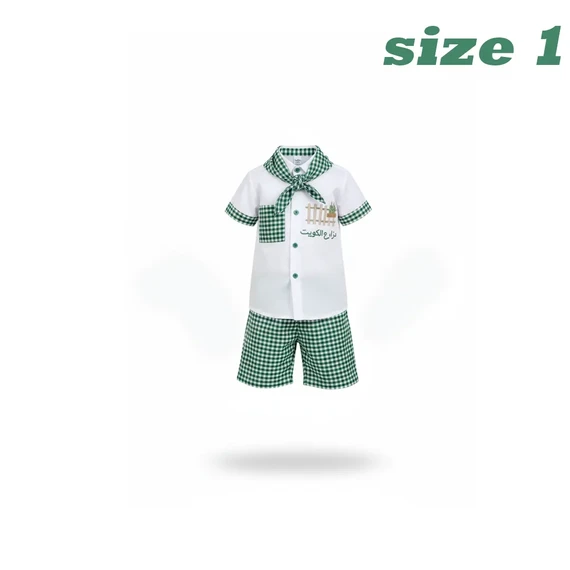 Kids outfit inspired by the Greening Season in Kuwait, combining a white embroidered shirt with the phrase "Farmer of Kuwait" and green checkered details for a practical and traditional touch.