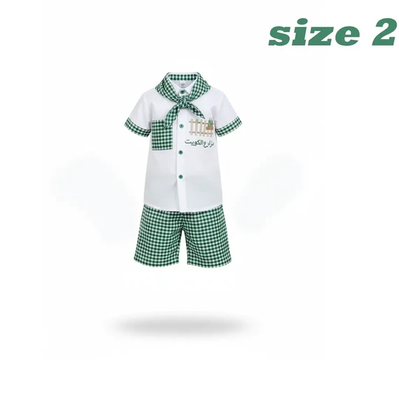 Kids outfit inspired by the Greening Season in Kuwait, combining a white embroidered shirt with the phrase "Farmer of Kuwait" and green checkered details for a practical and traditional touch.