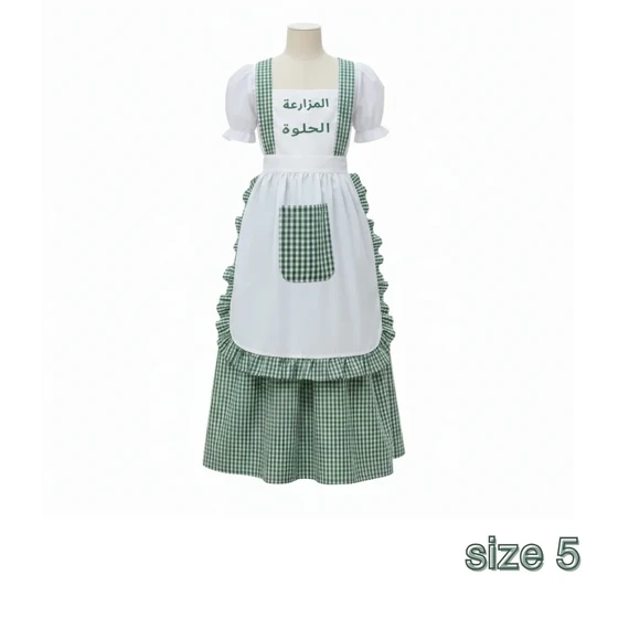 The outfit combines white with green checkered patterns, featuring a front apron with a practical pocket.