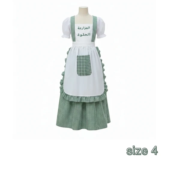 The outfit combines white with green checkered patterns, featuring a front apron with a practical pocket.
