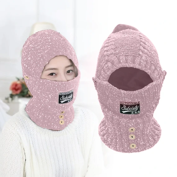 The hat is not limited to warming your head and ears; it also features an infinity scarf that wraps around your neck, accentuated with brown buttons, adding a touch of elegance to your look