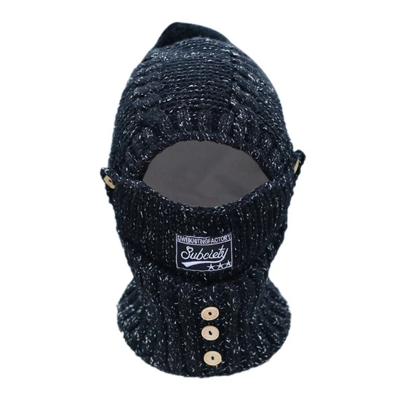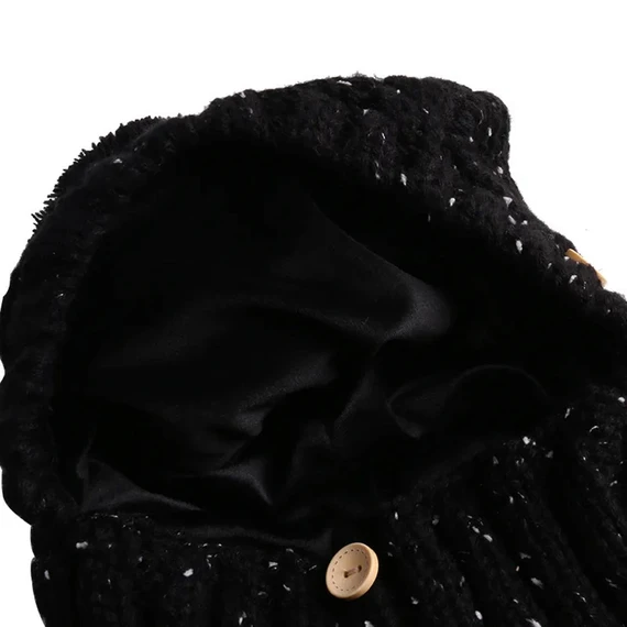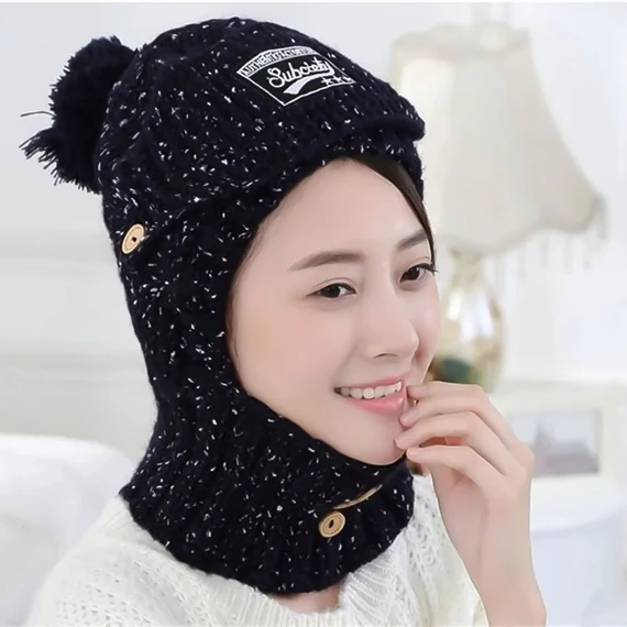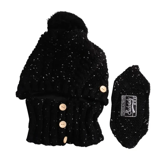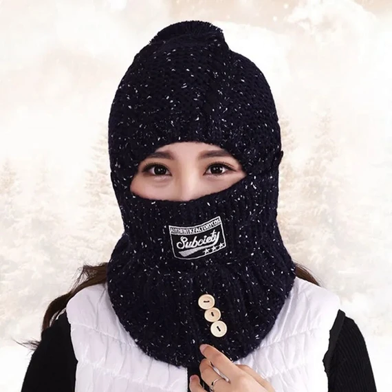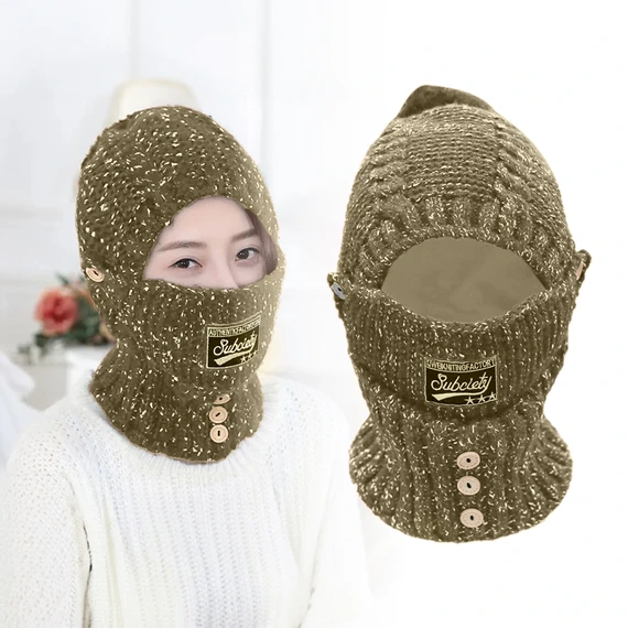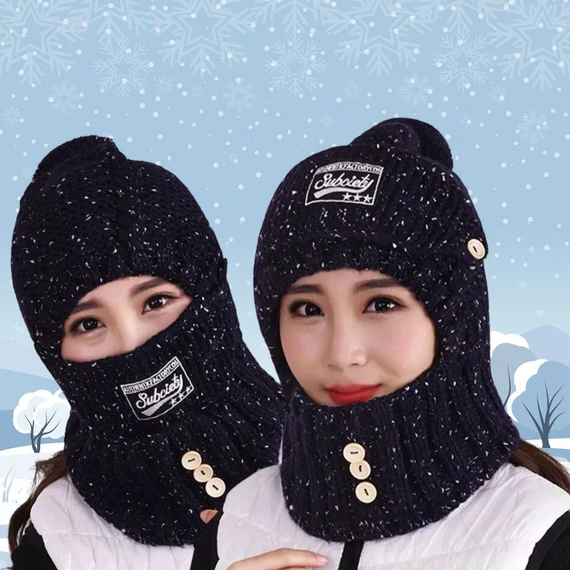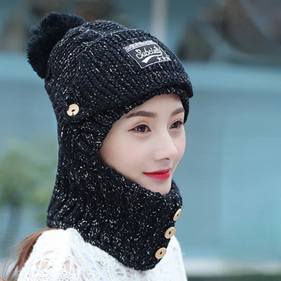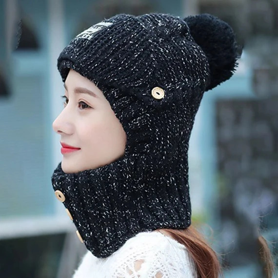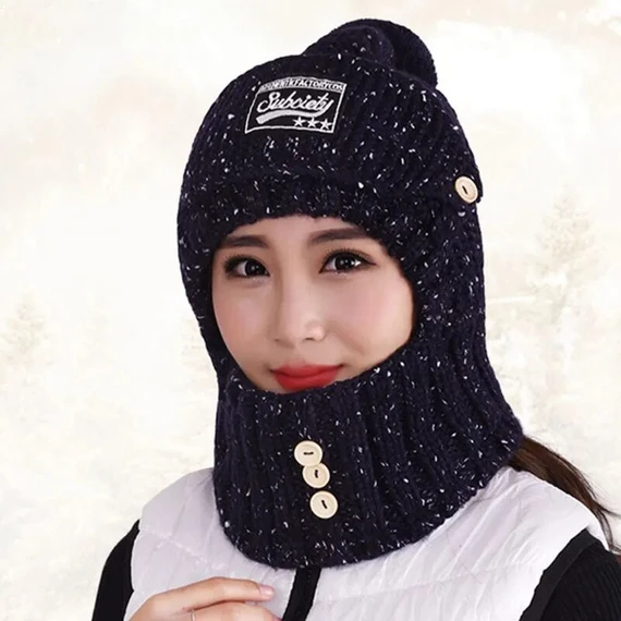 The hat is not limited to warming your head and ears; it also features an infinity scarf that wraps around your neck, accentuated with brown buttons, adding a touch of elegance to your look