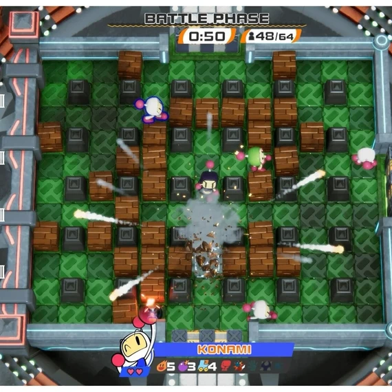 Castle Mode offers an asymmetric battle between defenders protecting their treasure and attackers trying to claim it. Standard Mode delivers the classic and beloved bomb-based gameplay. Grand Prix Mode brings team-based competition that rewards cooperation, while Battle 64 is a massive survival match for up to 64 players—only the best will remain standing!