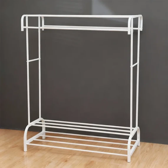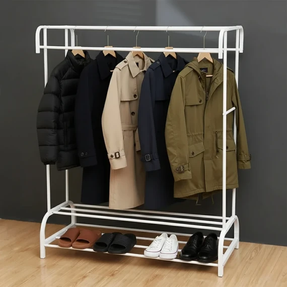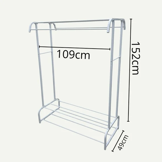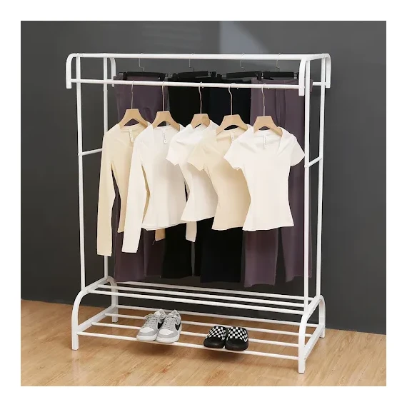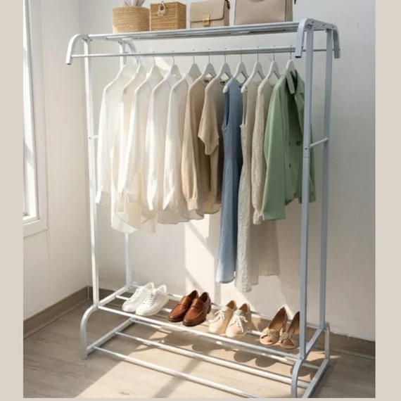 Features an intelligent two-tier design that allows for efficient use of space — hang clothes on the upper section, while the lower part provides two shelves for storing shoes, boxes, or small baskets, keeping your area tidy and stylish.