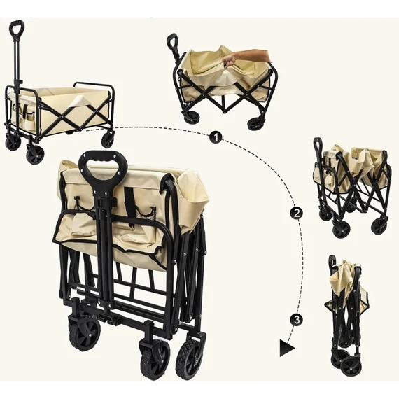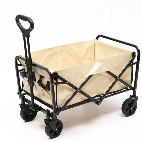 The cart's design allows it to be folded for easy storage and transportation, making it ideal for multiple uses such as gardens, homes, warehouses, and beaches.