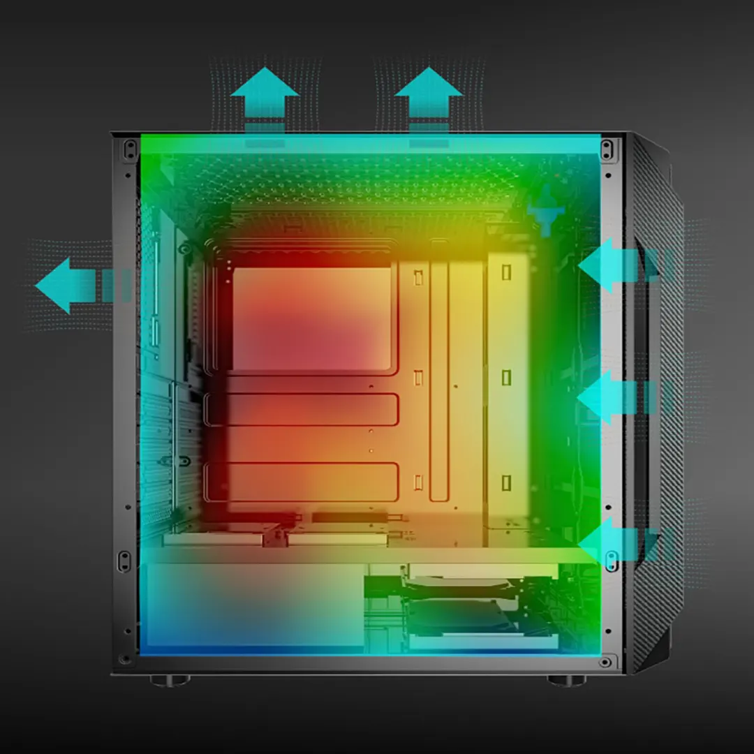 The AIGO ICE PRO 200 RGB CPU cooler maintains optimal processor temperatures, while four 1200 RPM RGB fans provide additional cooling to ensure system stability even during intense gaming sessions.